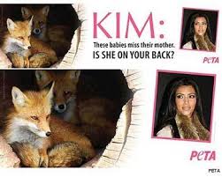 Dalam peringatan berbentuk iklan penuh emosional kepada Kim, PETA menampilkan gambar dua ekor bayi rubah dengan pernyataan berbunyi, “Kim, bayi-bayi ini merindukan ibu mereka. Apakah ibu mereka ada di punggungmu?". Selain iklan, PETA juga mengecam artis 31 tahun tersebut di situs mereka.